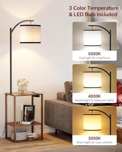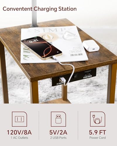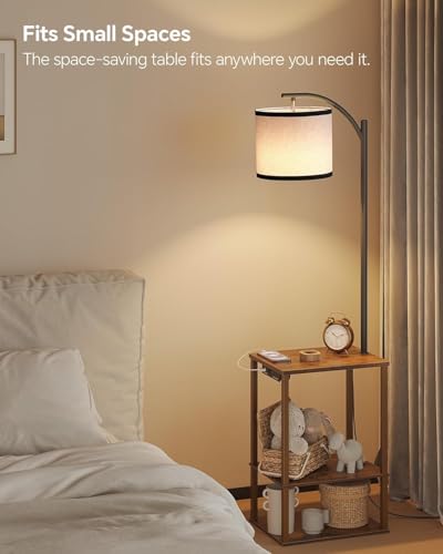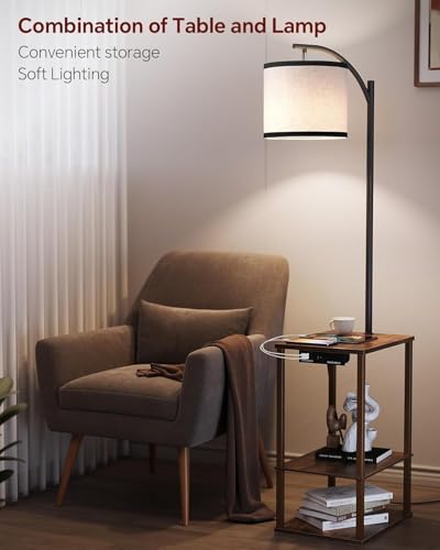 SUNMORY Floor Lamp with Table, End Table with Lamp, Shelves, Charging Station(USB & AC Port), 3-Color Temperature LED Bulb, Side Table Lamps for Living Room, Bedroom, Office, Rustic Brown