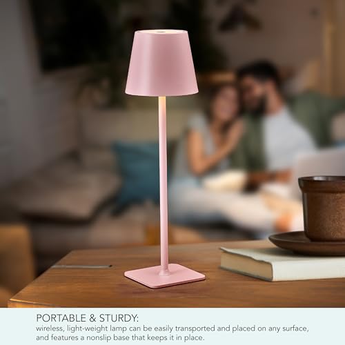 Mikasa LED Cordless Metal Table Lamp, Portable Rechargeable 5,000 mAh, 3 Color Stepless Dimming, Pink, 4.25×4.25×14.8 Inch